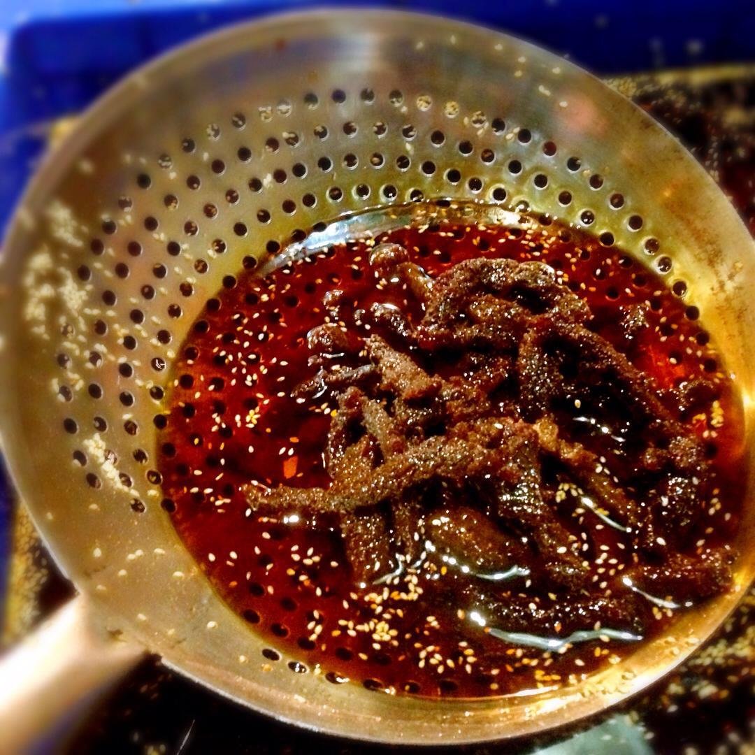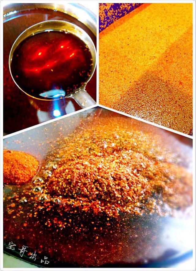 很多吃货问我,为什么我们的麻辣牛肉这么辣,现在告诉你们我们红油的制作:红油的熬制,我们采用了三种不同的辣椒,然后小火慢熬两个小时,再用香料跟核桃一起侵泡,放置一周,就成了醇香,麻辣,红亮的老道江湖厨师牛肉干的麻辣红油了!!!